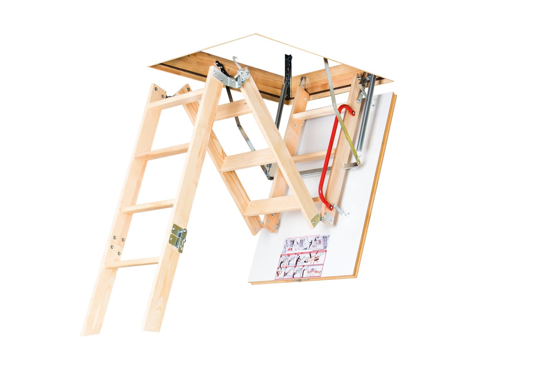 Schody LWK Plus to model schodów strychowych z 3 lub 4 segmentową drewniana drabinką i klapą termoizolacyjną obustronnie w kolorze białym. Kompletnie zmontowane, przygotowane do szybkiego montażu w stropie.