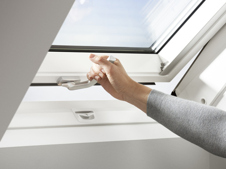 - Nowoczesna konstrukcja okna dachowego z górnym otwieraniem, zapewniająca wygodną obsługę nawet przy zabudowie pod oknem.